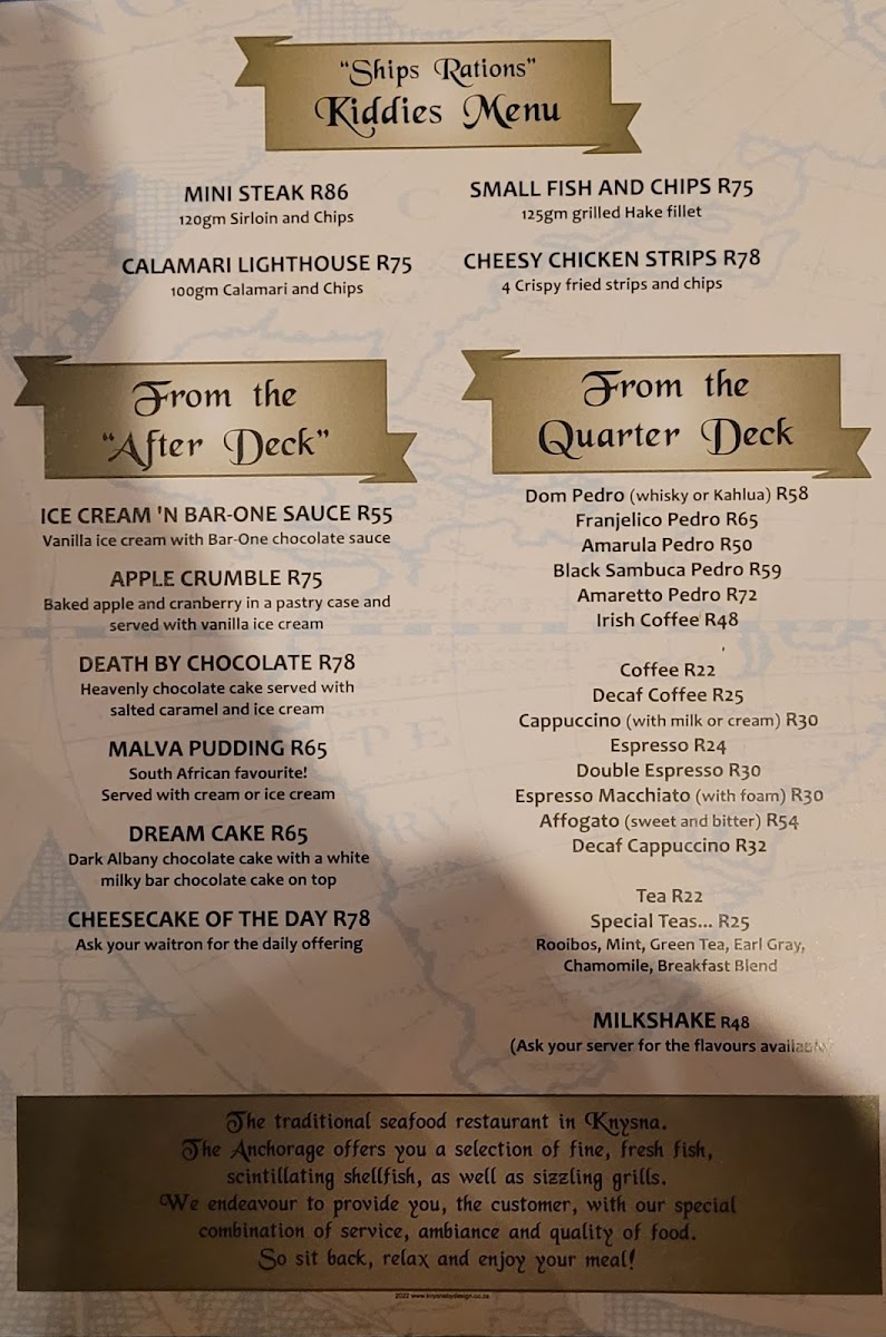Welcome to Anchorage Restaurant CC, a gem nestled in the heart of Knysna Central. Known as one of the oldest restaurants in town, it exudes a cozy ambiance perfect for all occasions, from family gatherings to romantic date nights. The menu highlights the freshest seafood, with dishes like Mozambique Prawns and a delectable Fish Duo, praised for their impeccable flavors and presentation.